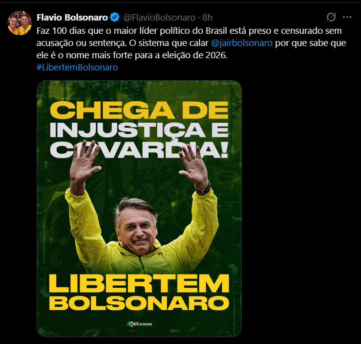 – Faz 100 dias que o maior líder político do Brasil está preso e censurado sem acusação ou sentença. O sistema quer calar Jair Bolsonaro, porque sabe que ele é o nome mais forte para a eleição de 2026. #LibertemBolsonaro – escreveu.