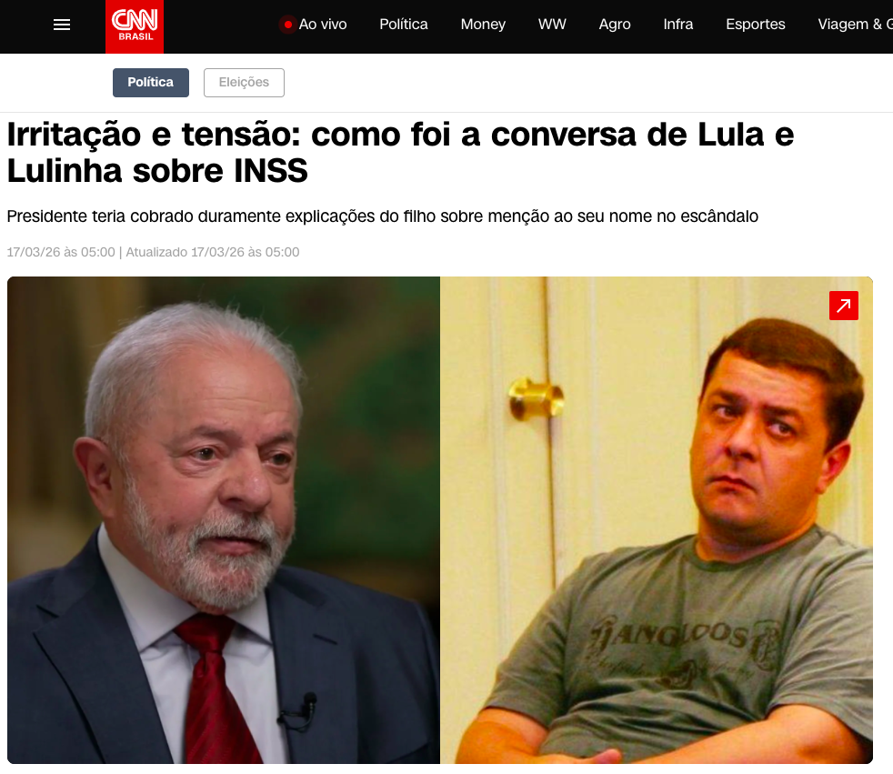 O petista Lula da Silva e seu filho Luís Cláudio Lula da Silva, conhecido como Lulinha, tiveram uma conversa marcada por irritação e tensão ao tratar das investigações envolvendo o Instituto Nacional do Seguro Social (INSS). O encontro, ocorrido recentemente, foi revelado pela colunista Clarissa Oliveira na CNN Brasil.