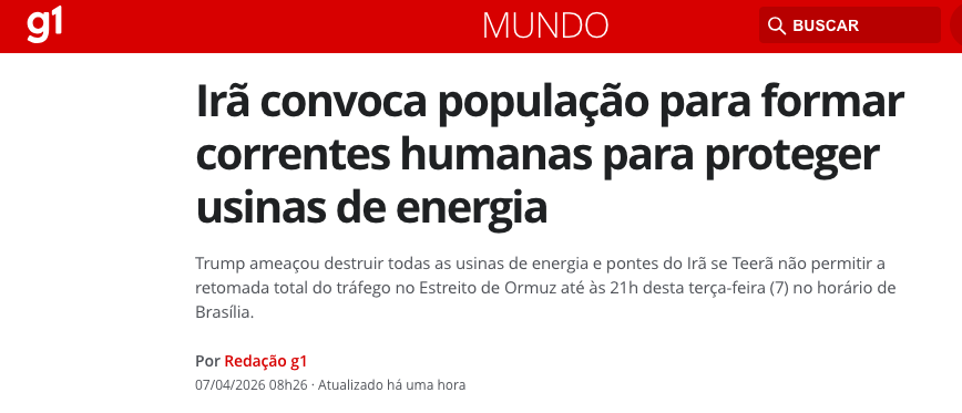 O governo do Irã declarou que está preparado para sacrificar vidas na defesa do país e convocou a população a formar escudos humanos ao redor de usinas de energia e pontes que o presidente Donald Trump ameaçou destruir, de acordo com a matéria da G1/Globo News.