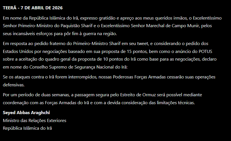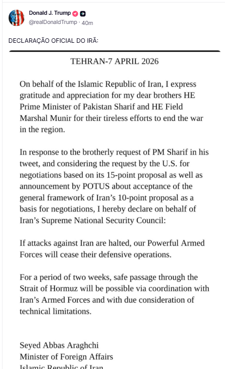 Em sua rede social, na noite desta terça-feira 07/04, o presidente DONALD TRUMP, publicou a declaração oficial do IRÃ após acordo com os Estados Unidos.