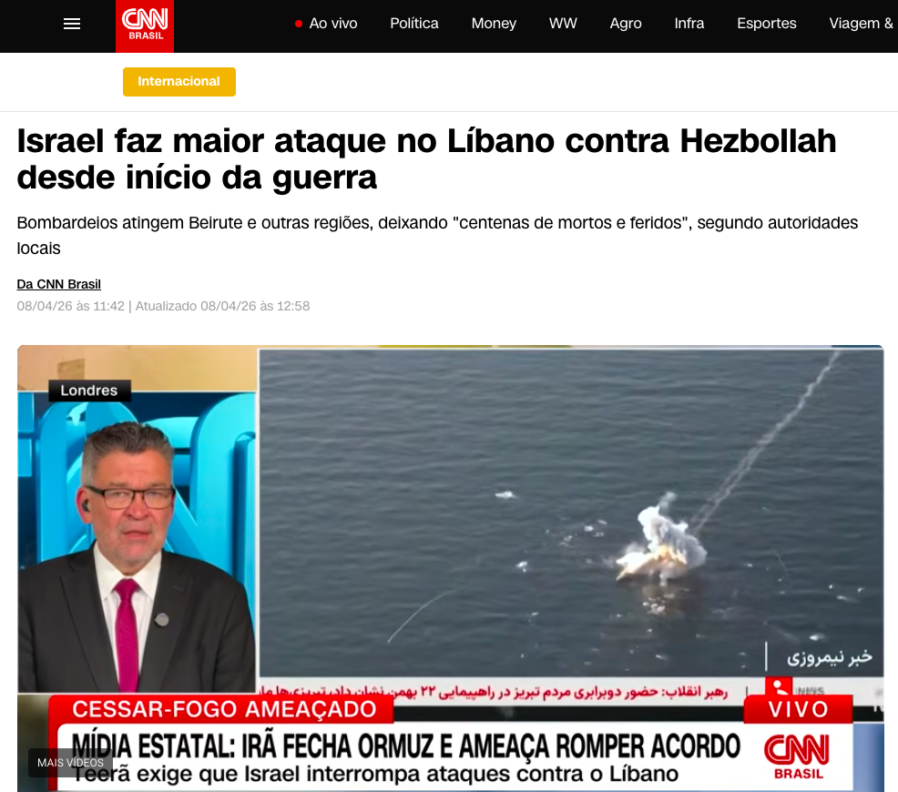 srael realizou nesta quarta-feira (8 de abril de 2026) seu maior ataque contra o Hezbollah no Líbano desde o início do conflito atual, de acordo com a CNN BRASIL.