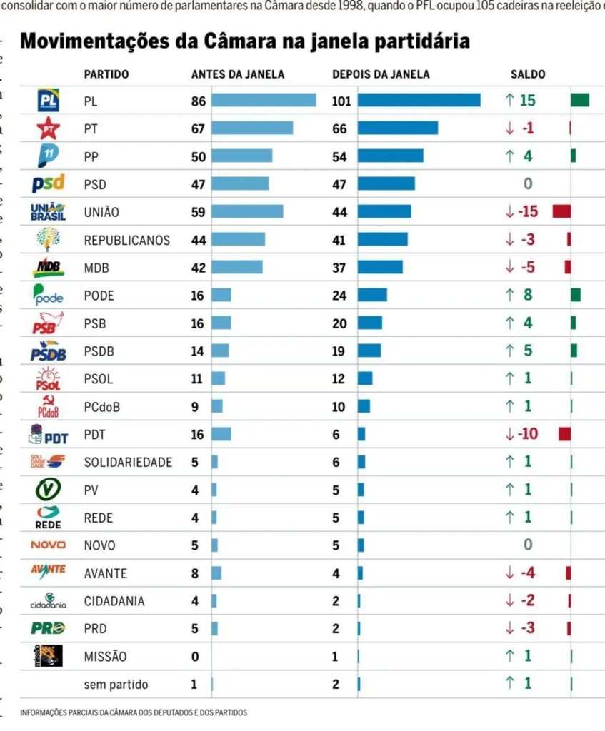 Partido Liberal consolida-se como maior bancada da Casa com forte saldo positivo; União Brasil, PDT, Avante e bloco Solidariedade/PRD aparecem entre os mais prejudicados após intensa troca de legendas