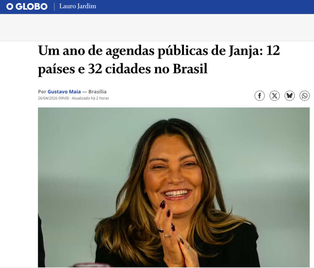 Janja da Silva completou, neste mês, um ano de divulgação oficial de sua agenda pública. A medida foi adotada pelo Palácio do Planalto seguindo orientação da Advocacia-Geral da União (AGU) sobre a atuação da esposa do petista Lula da Silva.