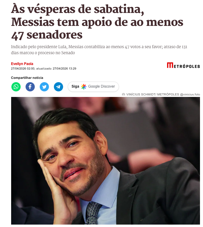 A informação foi apurada pelo portal Metrópoles e representa uma margem considerada suficiente para aprovação no plenário, onde são necessários no mínimo 41 votos favoráveis dos 81 senadores. Na CCJ, Messias precisa apenas da maioria simples dos presentes.