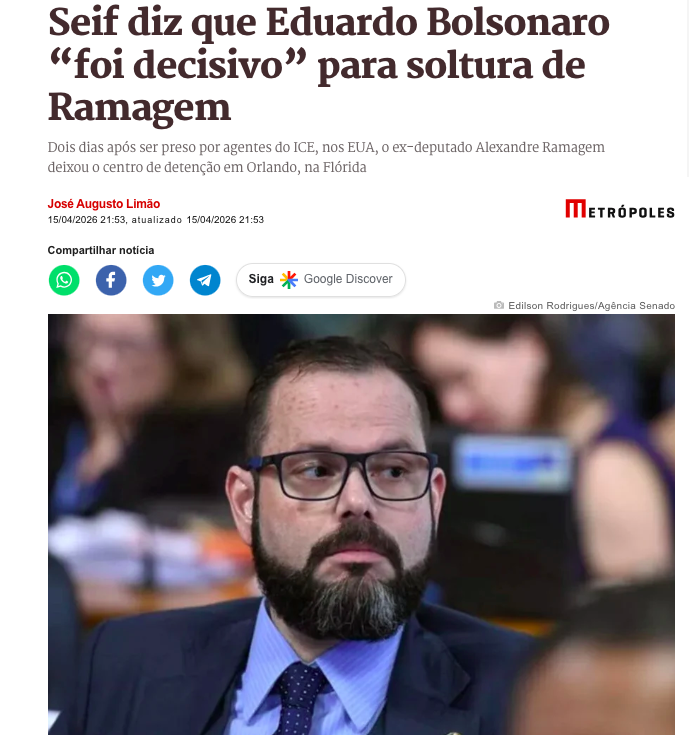 O senador Jorge Seif (PL-SC) afirmou que Eduardo Bolsonaro (PL) foi fundamental para a soltura do ex-diretor da Abin e ex-deputado federal Alexandre Ramagem, que deixou o centro de detenção do Serviço de Imigração e Controle de Aduanas (ICE), em Orlando, na Flórida, na quarta-feira (15), de acordo com a matéria do Metrópoles.
