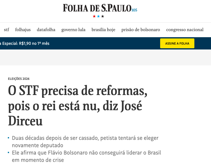 O ex-ministro da Casa Civil José Dirceu (PT), aos 80 anos, afirmou que o Supremo Tribunal Federal (STF) precisa passar por reformas porque “o rei está nu”. Duas décadas após ser cassado pela Câmara dos Deputados no escândalo do mensalão, Dirceu planeja disputar uma vaga na Câmara Federal nas eleições de 2026, de acordo com a matéria da Folha de São Paulo.