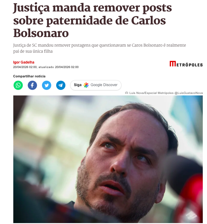 A Justiça de Santa Catarina determinou a remoção de postagens nas redes sociais que questionavam se Carlos Bolsonaro (PL) é o pai biológico de sua única filha. A decisão foi proferida em liminar pela juíza Liana Alves, da 1ª Vara Cível da Comarca de São José (SC), de acordo com a matéria do Metrópoles.