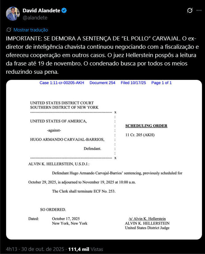A Justiça dos Estados Unidos decidiu adiar o julgamento de Hugo Armando Carvajal-Barrios, ex-general e chefe da inteligência militar da Venezuela, de 29 de outubro para 19 de novembro de 2025. A alteração consta em despacho oficial assinado pelo juiz Alvin K. Hellerstein, da Corte do Distrito Sul de Nova York, conforme documento registrado no sistema judicial norte-americano em 17 de outubro.