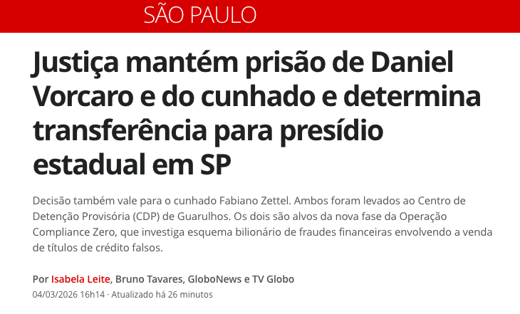 A Justiça Federal em São Paulo manteve, nesta quarta-feira (4 de março de 2026), a prisão preventiva do banqueiro Daniel Vorcaro, dono do Banco Master, e de seu cunhado Fabiano Zettel, durante audiência de custódia realizada na capital paulista.