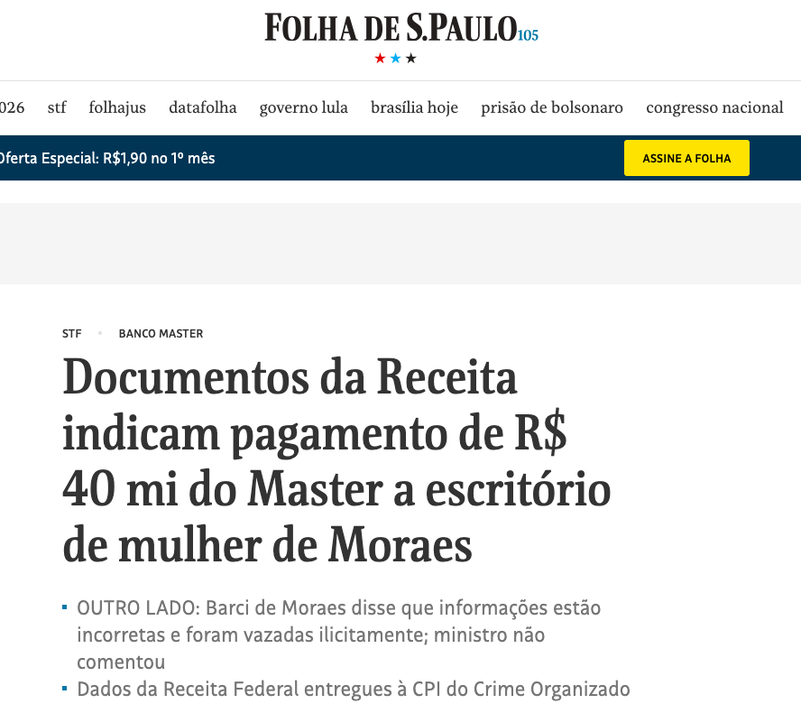 Documentos da Receita Federal enviados à CPI do Crime Organizado indicam que o Banco Master, de Daniel Vorcaro, realizou pagamentos no valor total de R$ 40.111.826,92 ao escritório de advocacia da esposa do ministro Alexandre de Moraes, do Supremo Tribunal Federal (STF), de acordo com a matéria da Folha de São Paulo.
