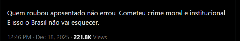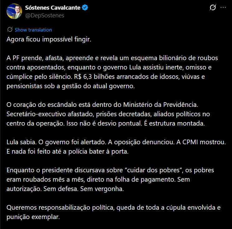 Neste 18/12, o líder do PL, Sóstenes Cavalcantes, uma dia antes de sofrer busca e apreensação da PF, o deputado fez uma revelação bombásticas em suas redes sociais sobre os desvios bilionários no esquerda do ROUBO DOS APOSENTADOS: