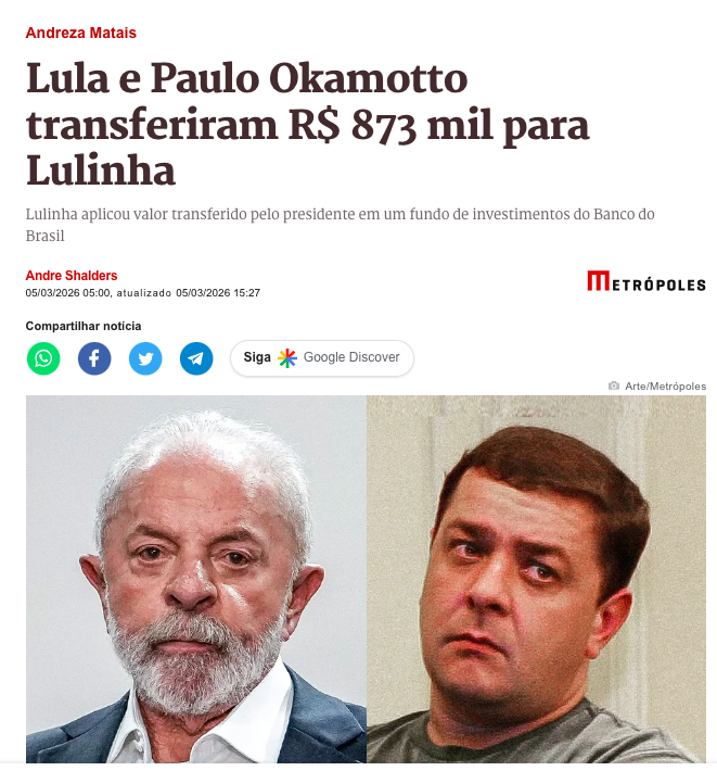 Dados obtidos pela quebra de sigilo bancário aprovada pela CPMI do INSS mostram que o petista Lula da Silva (PT) e o empresário Paulo Okamotto transferiram juntos R$ 873 mil para a conta pessoal de Fábio Luís Lula da Silva, o Lulinha, entre 2022 e 2025.