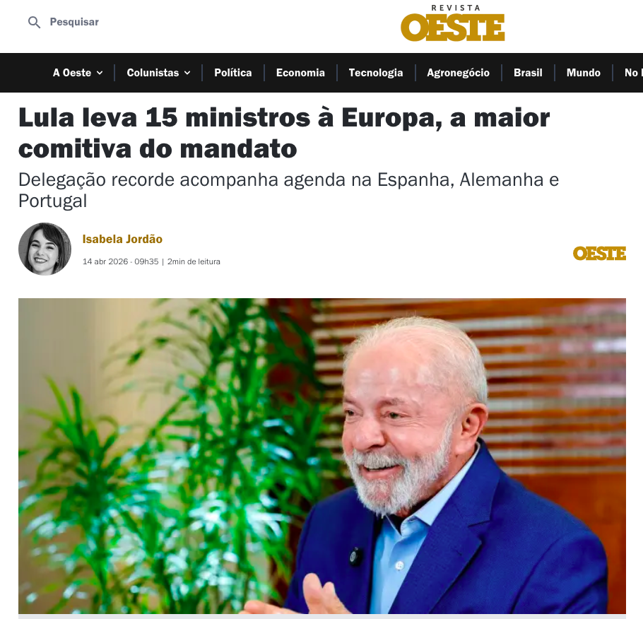 O petista Lula da Silva embarcará na próxima quinta-feira (16) para uma viagem à Europa acompanhado de 15 ministros, a maior comitiva ministerial de todo o seu terceiro mandato, de acordo com a matéria da Revista Oeste.