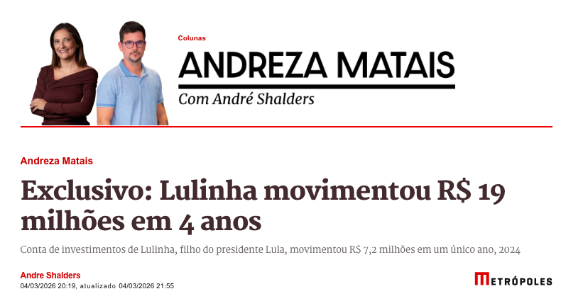 Uma única conta bancária de pessoa física em nome de Fábio Luís Lula da Silva, o Lulinha (filho do petista Lula da Silva), movimentou R$ 19,3 milhões entre 2022 e 2025, conforme dados obtidos exclusivamente pela coluna de Andreza Matais no Metrópoles a partir da quebra de sigilo aprovada pela CPMI do INSS.