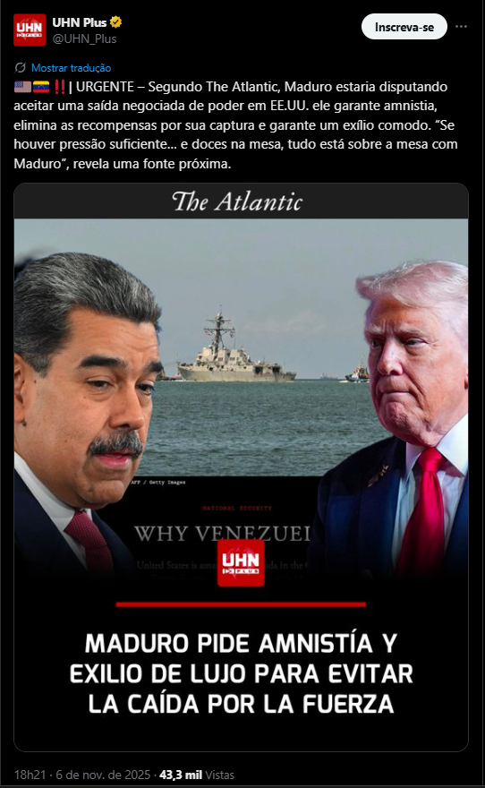 Na noite de 6 de novembro de 2025, uma informação divulgada pela The Atlantic e repercutida no X sugere que Nicolás Maduro, presidente da Venezuela, estaria disposto a negociar sua saída do poder.