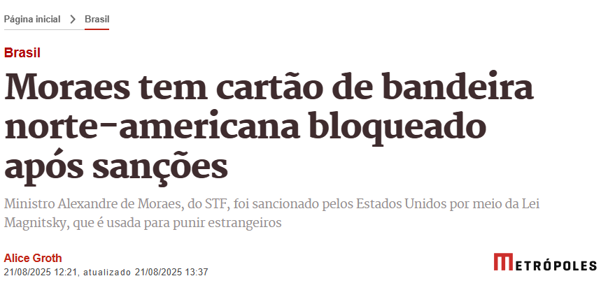 O ministro do Supremo Tribunal Federal (STF) Alexandre de Moraes teve um cartão da bandeira Mastercard, que é norte-americana, bloqueado. A medida foi consequência das sanções impostas pelo governo dos Estados Unidos, por meio da Lei Magnitsky, escreveu o portal Metrópoles