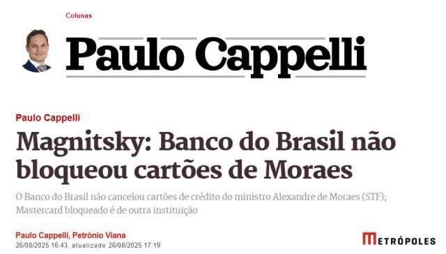 O Banco do Brasil não suspendeu os cartões de crédito internacionais do ministro Alexandre de Moraes, do Supremo Tribunal Federal (STF), em razão da sanção aplicada pelo governo Trump por meio da Lei Magnitsky.