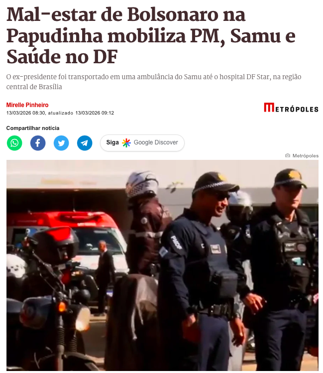 O Presidente Jair Bolsonaro (PL) apresentou mal-estar grave durante a madrugada desta sexta-feira (13) enquanto cumpria pena no 19º Batalhão da PMDF (Papudinha). O episódio, que incluiu vômitos intensos, calafrios e queda de saturação de oxigênio, mobilizou imediatamente a Polícia Militar, o Serviço de Atendimento Móvel de Urgência (Samu) e a Secretaria de Saúde do Distrito Federal, de acordo com a matéria do Metrópoles.