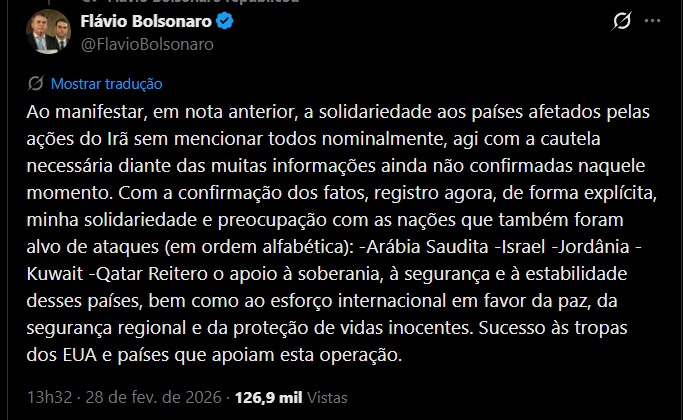 “O que não pode é escolher o alinhamento moralmente errado, legitimando um regime que promove instabilidade e países que ameaçam parceiros do nosso próprio interesse estratégico”, escreveu Flávio. Ele reforçou que neutralidade não significa complacência e que “contenção não pode significar apoio indireto a regimes que promovem terror, desestabilização e sofrimento”.