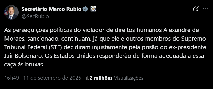 “As perseguições políticas do violador de direitos humanos Alexandre de Moraes, sancionado, continuam, já que ele e outros membros do Supremo Tribunal Federal (STF) decidiram injustamente pela prisão do ex-presidente Jair Bolsonaro”, disse Rubio. O titular da pasta afirmou ainda que os Estados Unidos “responderão de forma adequada a essa caça às bruxas”.