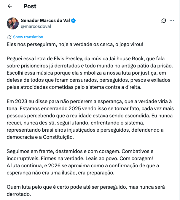 A publicação ocorre enquanto Marcos do Val enfrenta restrições impostas pelo STF. Em 4 de agosto deste ano, o ministro Alexandre de Moraes aplicou medidas cautelares ao senador após ele viajar aos Estados Unidos sem autorização judicial.