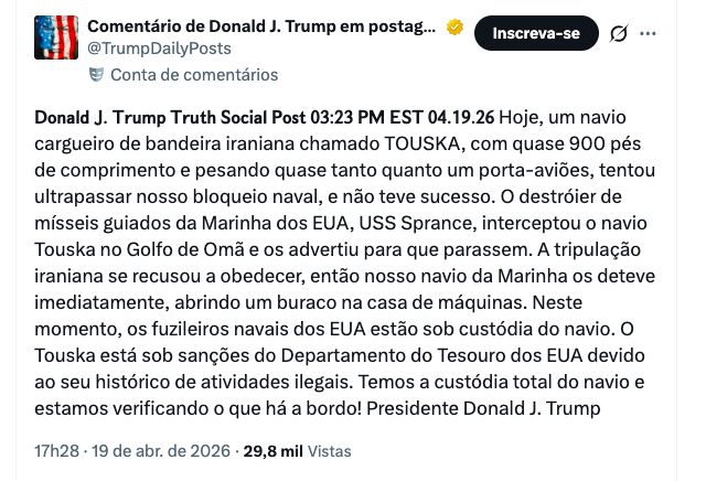 O presidente dos Estados Unidos, Donald Trump, anunciou neste domingo (19 de abril de 2026) que forças americanas apreenderam um navio cargueiro de bandeira iraniana após ele tentar ultrapassar o bloqueio naval imposto pelos EUA no Golfo de Omã.