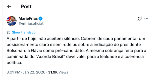 “A partir de hoje, não aceitem silêncio. Cobrem de cada parlamentar um posicionamento claro e sem rodeios sobre a indicação do presidente Bolsonaro a Flávio como pré-candidato. A mesma cobrança feita para a caminhada do “Acorda Brasil” deve valer para a lealdade e a coerência política.”