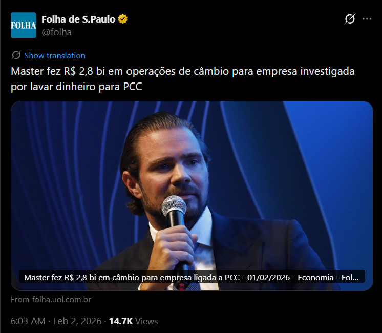 Banco Master realizou remessas de R$ 2,8 bilhões para empresa sob investigação por lavagem de dinheiro ligada ao PCC e Hezbollah, revela Folha de S.Paulo