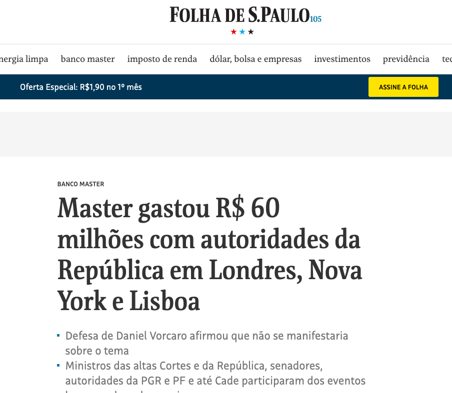 O Banco Master gastou pelo menos R$ 60 milhões com autoridades da República em eventos de luxo realizados em Londres, Nova York e Lisboa entre 2023 e 2025, de acordo com a matéria da Folha de São Paulo.