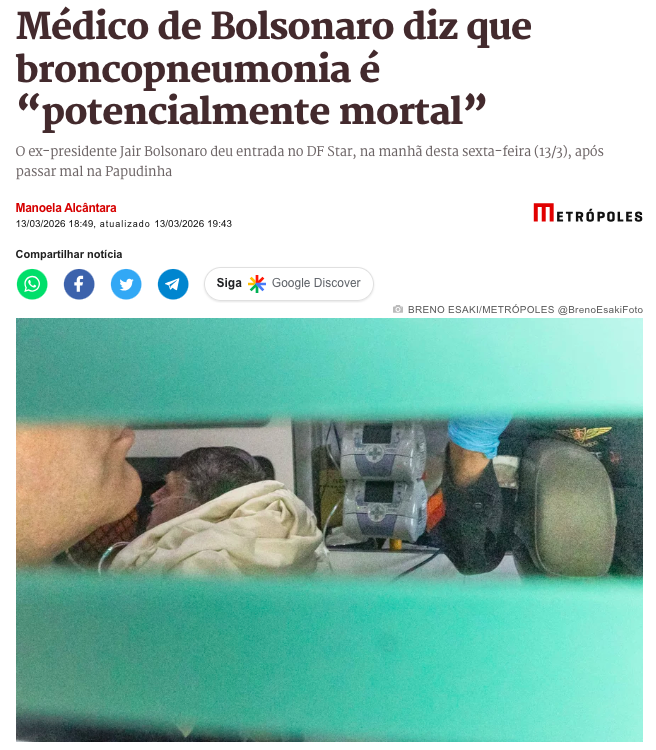 O médico que acompanha Jair Bolsonaro (PL) há anos classificou o diagnóstico de broncopneumonia como “potencialmente mortal”, especialmente considerando o histórico clínico do ex-presidente e as condições de sua custódia na Papudinha (19º Batalhão da PMDF). A declaração foi dada em contato com a coluna de Manoela Alcântara, do Metrópoles, horas após Bolsonaro ser internado no Hospital das Forças Armadas (HFA) com quadro de infecção respiratória grave, de acordo com a matéria do matrópoles.