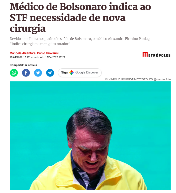 O médico Alexandre Firmino Paniago, especialista em ombro e cotovelo, indicou ao Supremo Tribunal Federal (STF) a necessidade de realização de uma nova cirurgia em Jair Bolsonaro, de acordo com a matéria do Metrópoles.