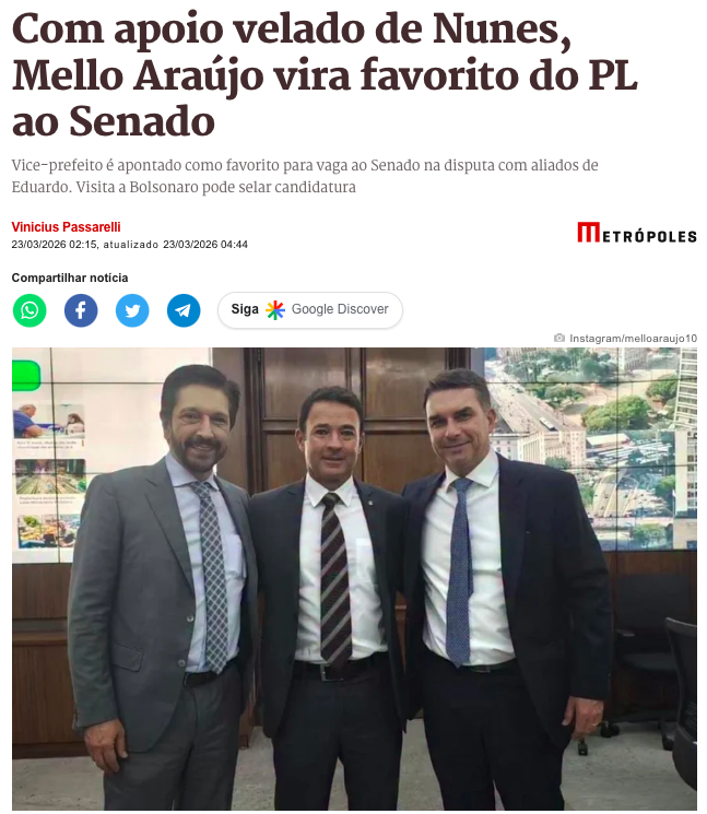 O vice-prefeito de São Paulo, coronel Ricardo Mello Araújo (PL), emerge como o principal favorito para representar o partido na disputa por uma vaga ao Senado nas eleições de 2026, na chapa majoritária possivelmente encabeçada pelo governador Tarcísio de Freitas (Republicanos). A preferência interna ganha força graças à amizade pessoal com o presidente Jair Bolsonaro (PL), que vê Mello como nome de confiança, de acordo com a matéria do Metrópoles.