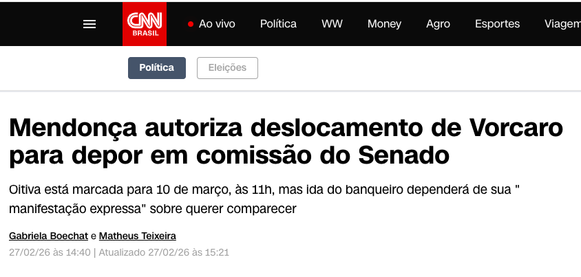 O ministro André Mendonça, do Supremo Tribunal Federal (STF), autorizou nesta sexta-feira (27) o deslocamento de Daniel Vorcaro, controlador do Banco Master, para prestar depoimento na Comissão de Assuntos Econômicos (CAE) do Senado.