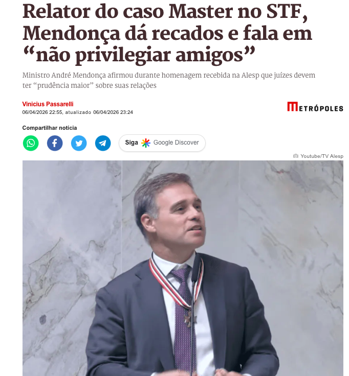 Durante sessão solene em sua homenagem na Assembleia Legislativa de São Paulo (Alesp), nesta segunda-feira (6 de abril de 2026), Mendonça discursou por mais de 20 minutos e enviou recados indiretos ao Poder Judiciário, que enfrenta questionamentos sobre sua credibilidade.