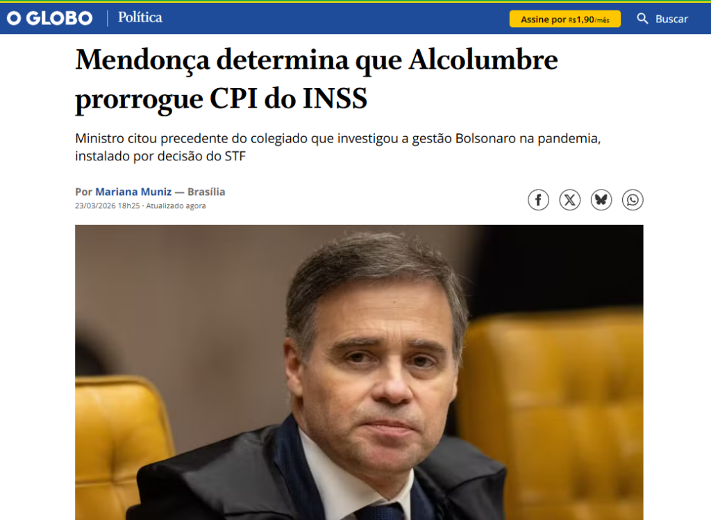 O ministro André Mendonça, do Supremo Tribunal Federal (STF), decidiu determinar ao Congresso Nacional a prorrogação da CPI do INSS. Mendonça é o relator das investigações envolvendo o escândalo na Corte. A liminar será analisada pelo plenário do STF entre os dias 3 e 13 de abril.