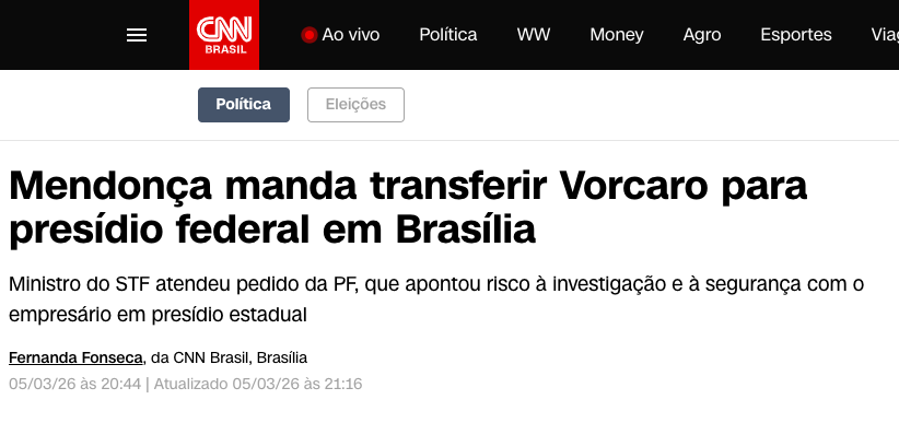 O ministro André Mendonça, do Supremo Tribunal Federal (STF), determinou na quinta-feira (5 de março de 2026) a transferência imediata de Daniel Vorcaro, ex-controlador do Banco Master, para um presídio federal em Brasília.