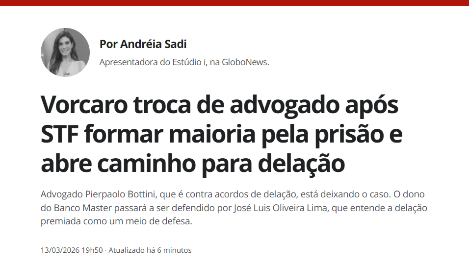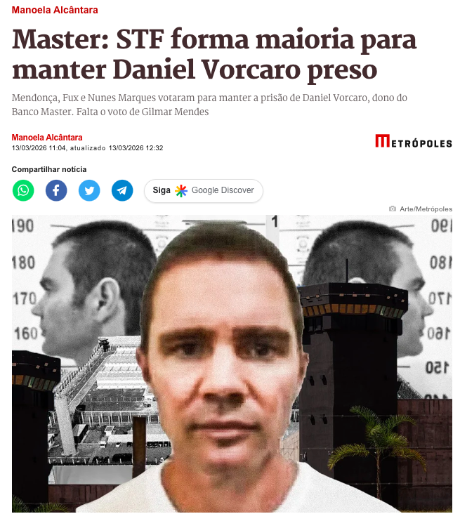 O ministro André Mendonça, relator do processo no Supremo Tribunal Federal (STF), votou pela manutenção da prisão preventiva de Daniel Vorcaro, ex-controlador do Banco Master, no julgamento virtual iniciado nesta sexta-feira (13) na Segunda Turma, de acordo com a matéria do Metrópoles.