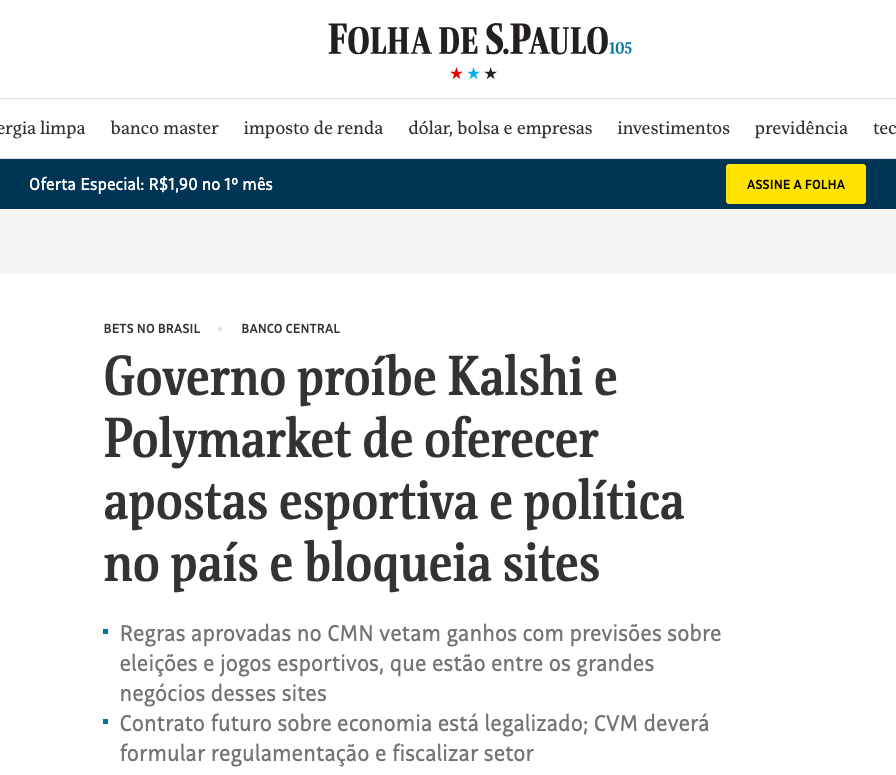Mercado Preditivo: Governo Brasileiro veta Kalshi e Polymarket e ordena bloqueio de plataformas