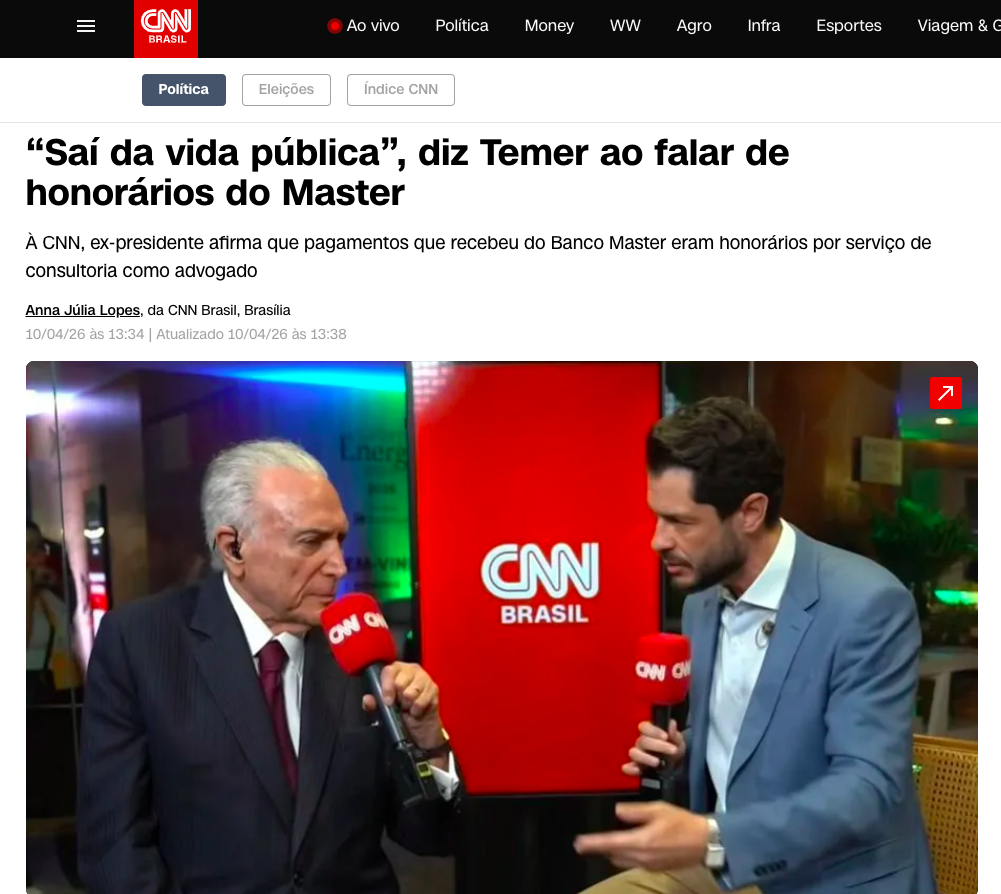 O ex-presidente da República Michel Temer (MDB) admitiu ter prestado serviços ao Banco Master por meio de seu escritório de advocacia. Em declaração à CNN Brasil nesta sexta-feira (10 de abril de 2026), ele enfatizou que os pagamentos referem-se a honorários advocatícios normais, recebidos após deixar a vida pública.