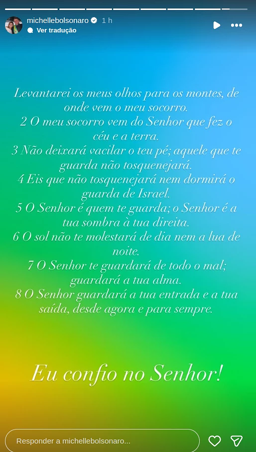 A eterna primeira-dama Michelle Bolsonaro se manifestou na manhã deste sábado (22), logo após a prisão do presidente Jair Bolsonaro (PL). A líder nacional do Pl Mulher usou uma passagem bíblicar que fala sobre o socorro que só vem de Deus.por Alexandre de Moraes