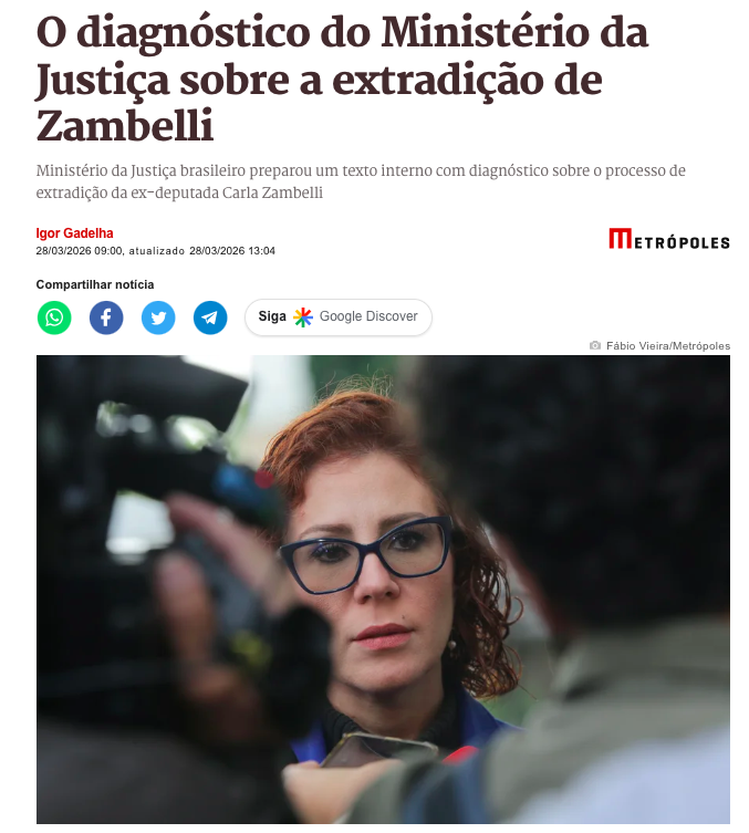 O Ministério da Justiça elaborou um diagnóstico interno sobre as chances e os próximos passos para a extradição de Carla Zambelli da Itália para o Brasil. A ex-deputada federal (PL-SP) está presa em Roma desde julho de 2025 e foi condenada pelo Supremo Tribunal Federal (STF) a 10 anos de reclusão por ser considerada autora intelectual da invasão aos sistemas do Conselho Nacional de Justiça (CNJ) em janeiro de 2023, de acordo com a matéria do Metrópoles.