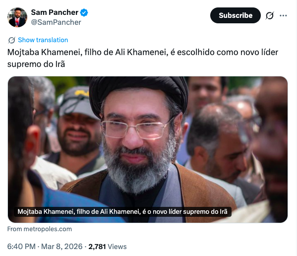 A Assembleia de Especialistas do Irã confirmou na sexta-feira (6 de março de 2026) a escolha de Mojtaba Khamenei, filho do falecido líder supremo Ali Khamenei, como o novo Líder Supremo do país.