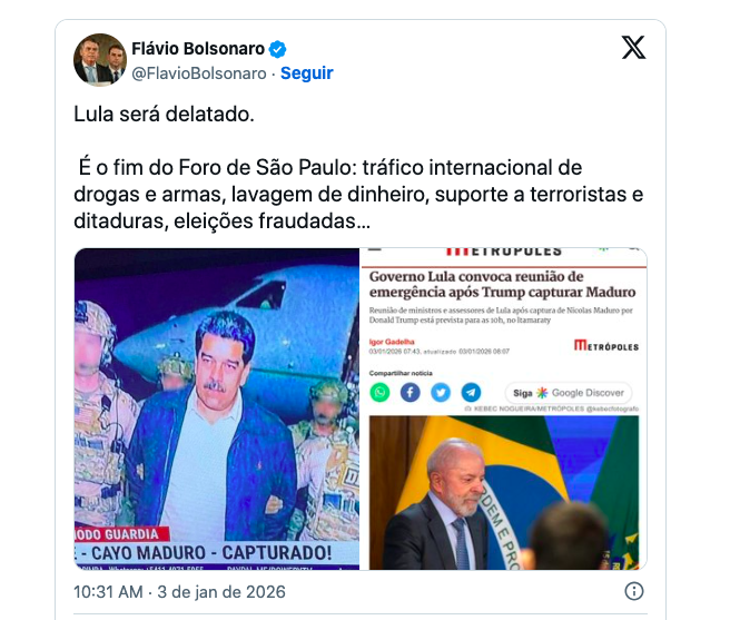 O caso tem origem em uma publicação feita por Flávio Bolsonaro na rede social X em janeiro de 2026. Na postagem, o senador associou imagens de Lula ao ditador venezuelano Nicolás Maduro e afirmou que o presidente seria delatado, listando uma série de crimes. A frase exata da publicação foi: