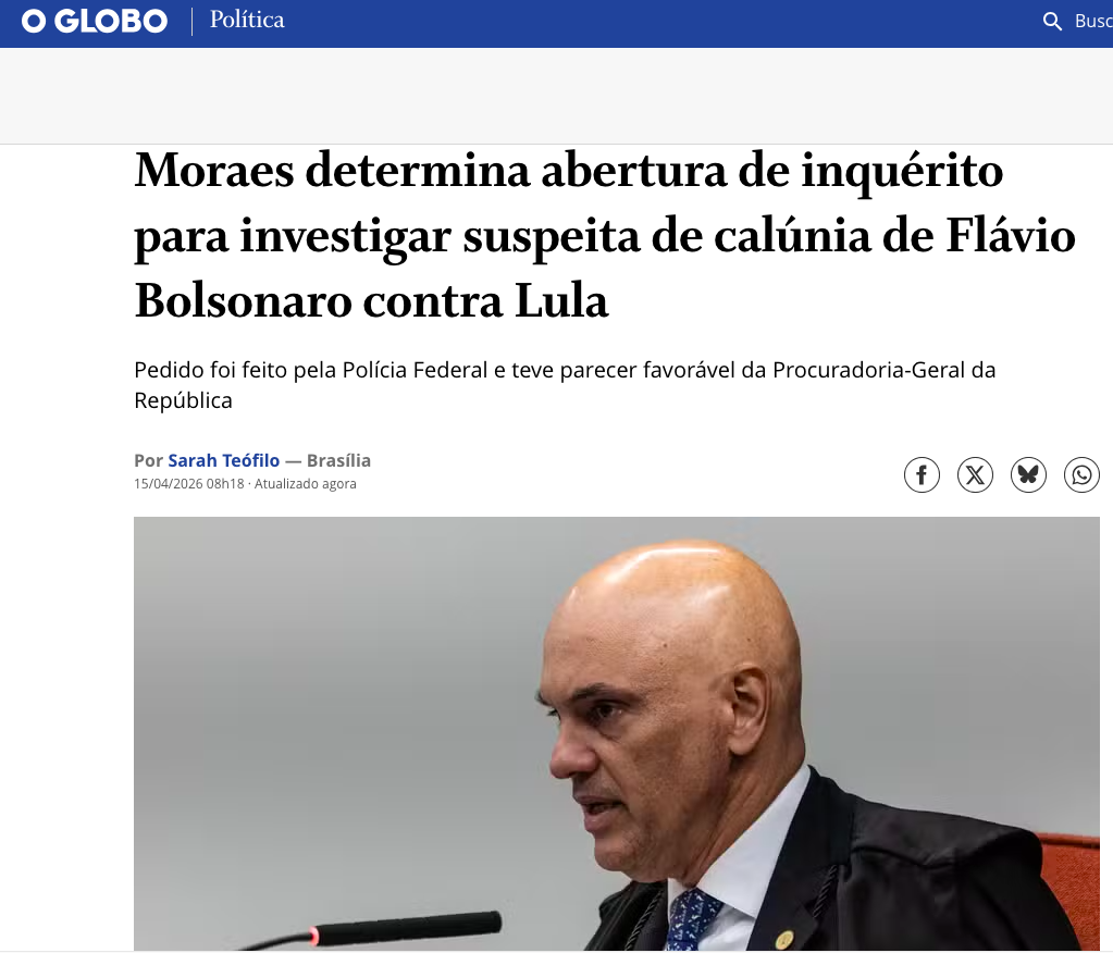 O ministro Alexandre de Moraes, do Supremo Tribunal Federal (STF), determinou a abertura de inquérito policial para investigar o senador Flávio Bolsonaro (PL-RJ) por suspeita de calúnia contra o petista Lula da Silva. A decisão foi tomada na segunda-feira (13 de abril de 2026) e os autos foram enviados à Polícia Federal, que terá 60 dias para realizar as investigações, de acordo com a matéria do O GLOBO.