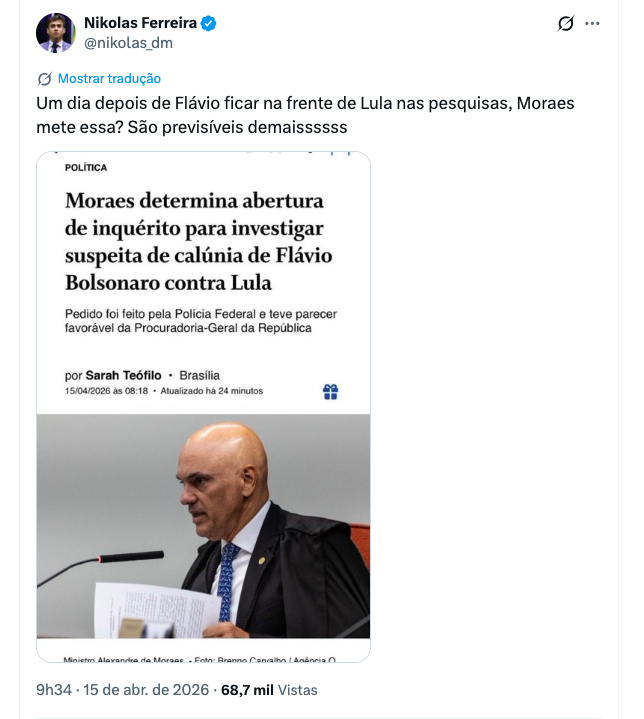 “Um dia depois de Flávio ficar na frente de Lula nas pesquisas, Moraes mete essa? São previsíveis demaissssss.”