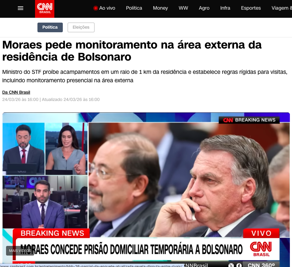 O ministro Alexandre de Moraes, do Supremo Tribunal Federal (STF), determinou nesta terça-feira o reforço no controle externo da residência de Jair Bolsonaro, onde o presidente cumprirá temporariamente prisão domiciliar por 90 dias enquanto se recupera de broncopneumonia, de acordo com a matéria da CNN BRASIL.