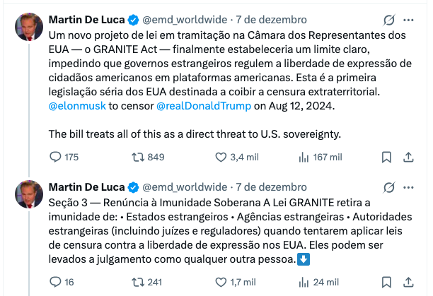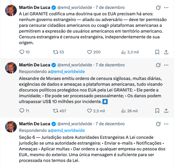 “Alexandre de Moraes emitiu ordens de censura sigilosas, multas diárias, exigências de dados e ameaças a plataformas americanas, tudo visando discursos políticos protegidos nos EUA. Nos termos da Lei GRANITE: Ele perde a imunidade; ele pode ser processado pessoalmente; os danos podem ultrapassar 10 milhões de dólares por incidente; suas ordens não podem ser reconhecidas nos EUA. Ele é o exemplo paradigmático para o qual o projeto de lei foi criado”, escreveu o advogado.