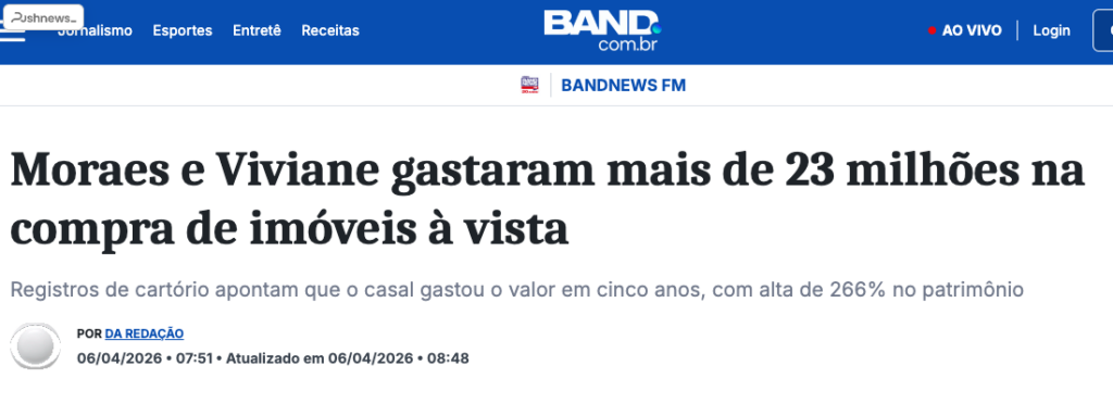 A reportagem também menciona viagens do casal em jatinhos ligados ao empresário Daniel Vorcaro, controlador do Banco Master. Procurados pelo jornal O Estado de S. Paulo, Viviane Barci e Alexandre de Moraes não comentaram os detalhes das aquisições imobiliárias nem dos voos.