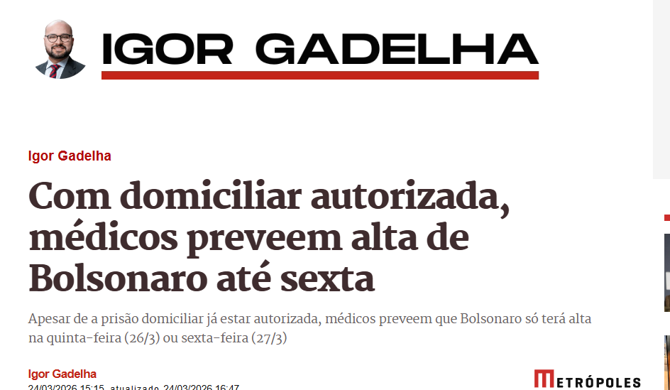 Sob reserva, médicos ouvidos pelo Metópoles dizem que a previsão é que Bolsonaro deixe o hospital na quinta-feira (26/3) ou na sexta-feira (27/3) — data considerada mais provável, em razão do ciclo de antibióticos.