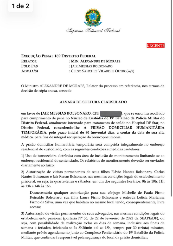 O ministro Alexandre de Moraes, do Supremo Tribunal Federal (STF), expediu alvará para que o presidente Jair Bolsonaro (PL) cumpra domiciliar.